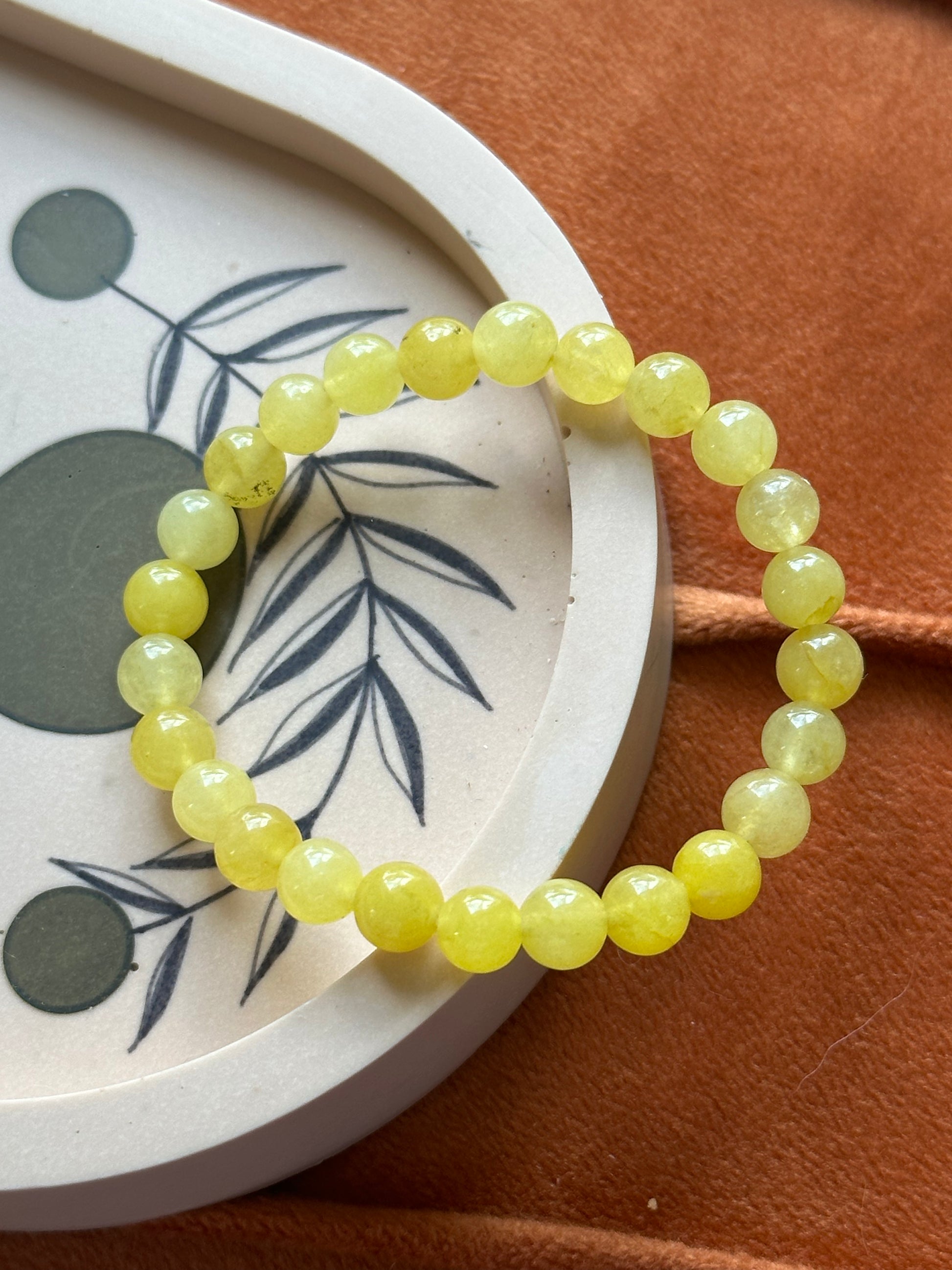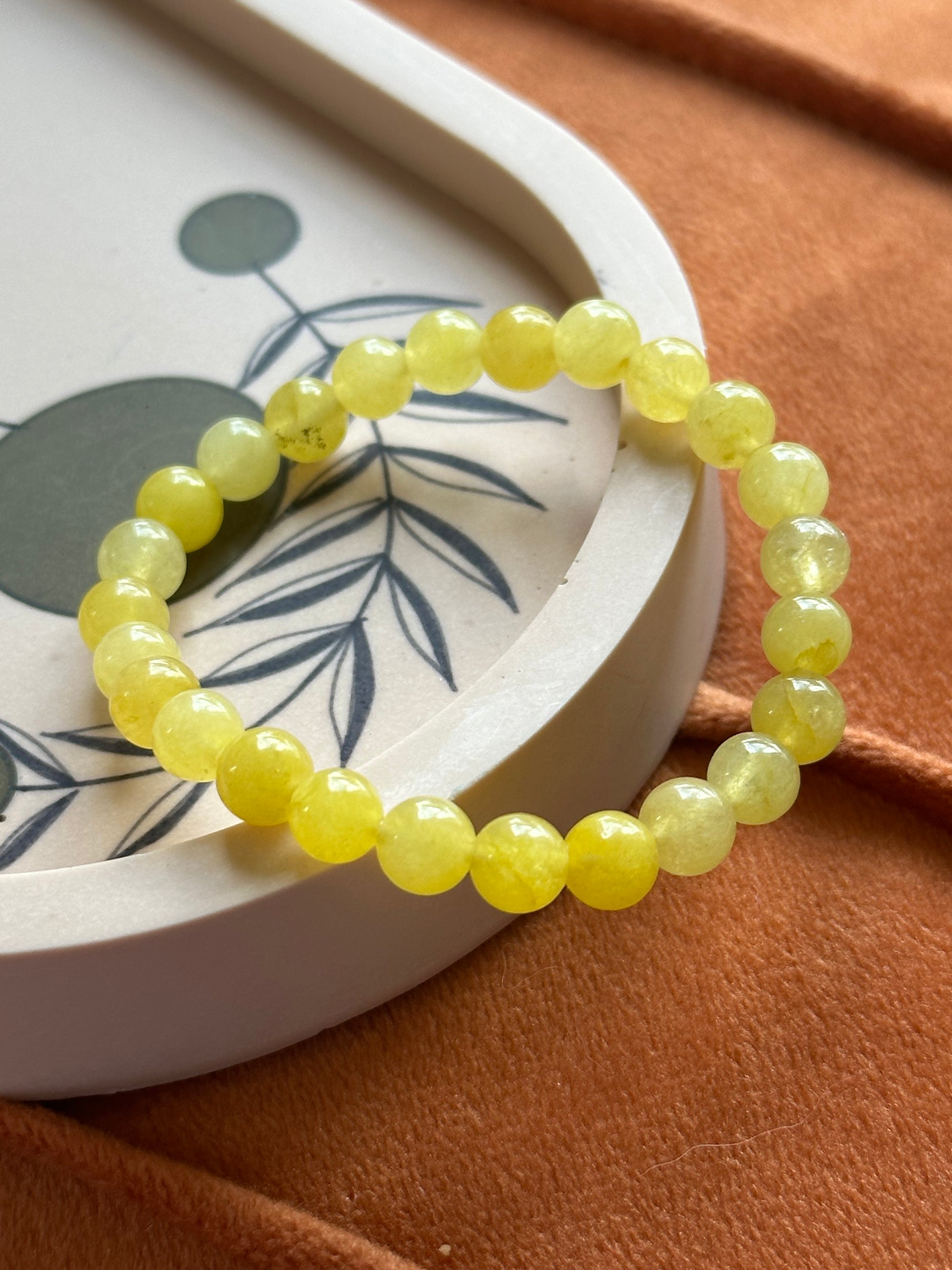 Ook voor kinderen hebben wij diverse armbanden op voorraad. Deze armband is gemaakt met Gele Calciet kralen (met een grootte van 6 mm) en geregen op een dubbel elastiek, hierdoor zijn de armbanden extra stevig en kan elk kind hier lang van genieten. Het elastiek zorgt ervoor dat de armbandjes op verschillende maten draagbaar zijn.