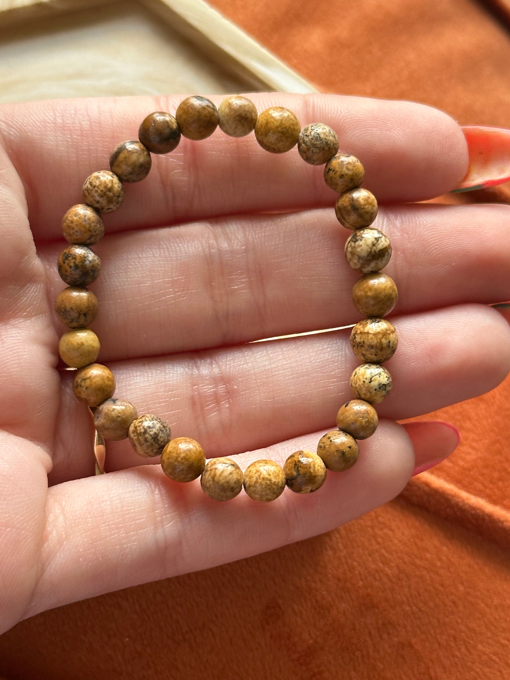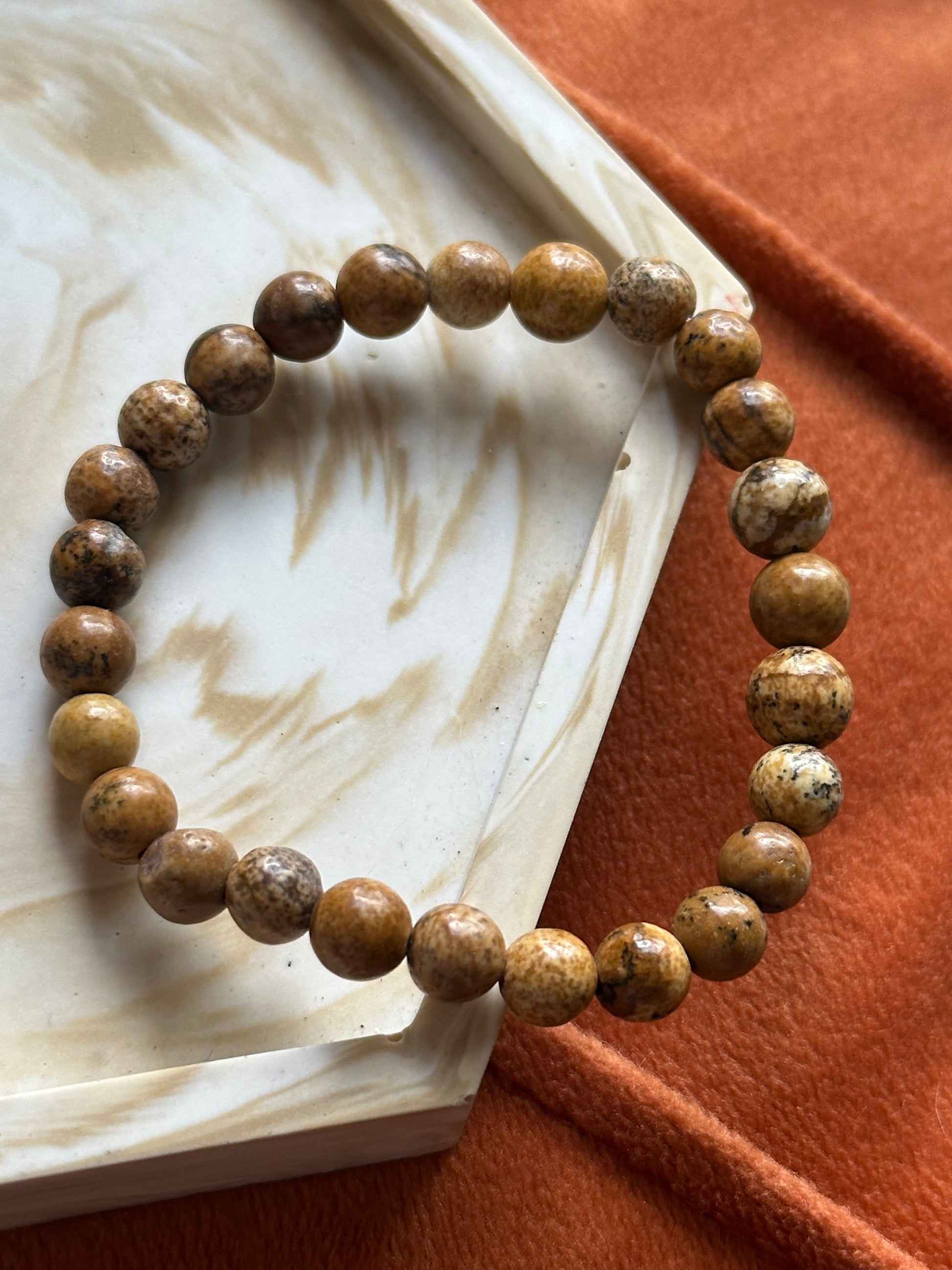 Ook voor kinderen hebben wij diverse armbanden op voorraad. Deze armband is gemaakt met Picture Jaspis kralen (met een grootte van 6 mm) en geregen op een dubbel elastiek, hierdoor zijn de armbanden extra stevig en kan elk kind hier lang van genieten. Het elastiek zorgt ervoor dat de armbandjes op verschillende maten draagbaar zijn.