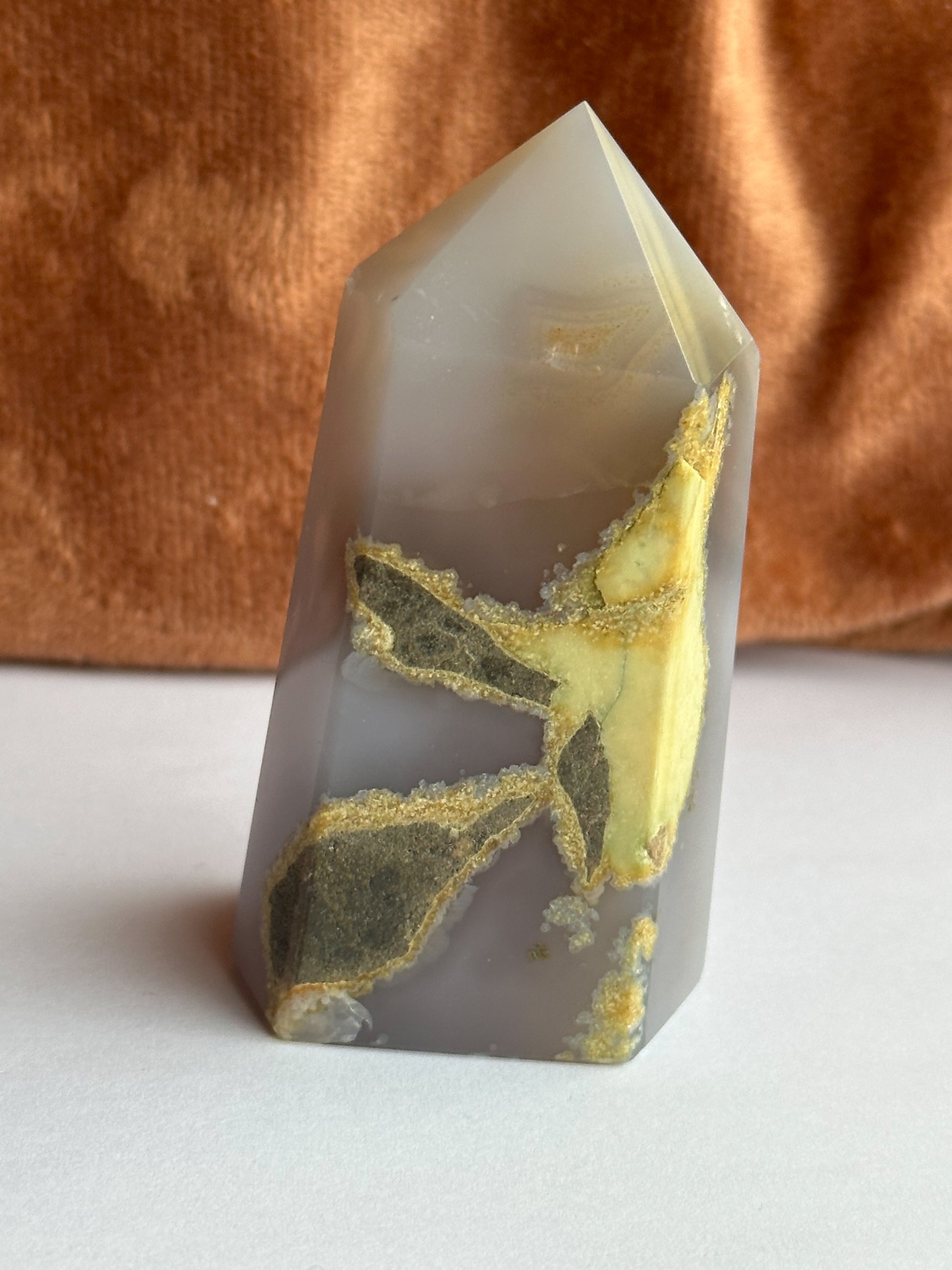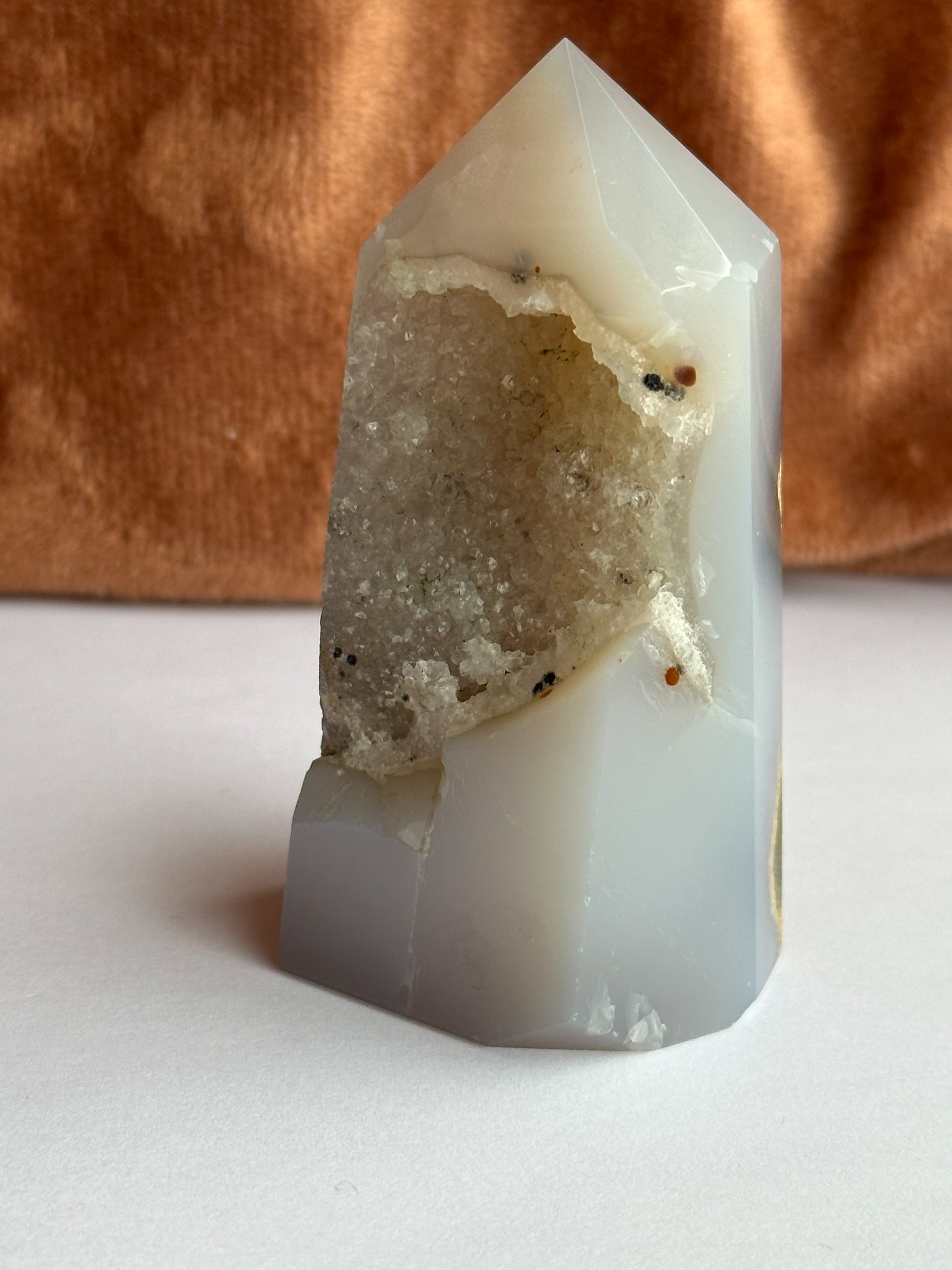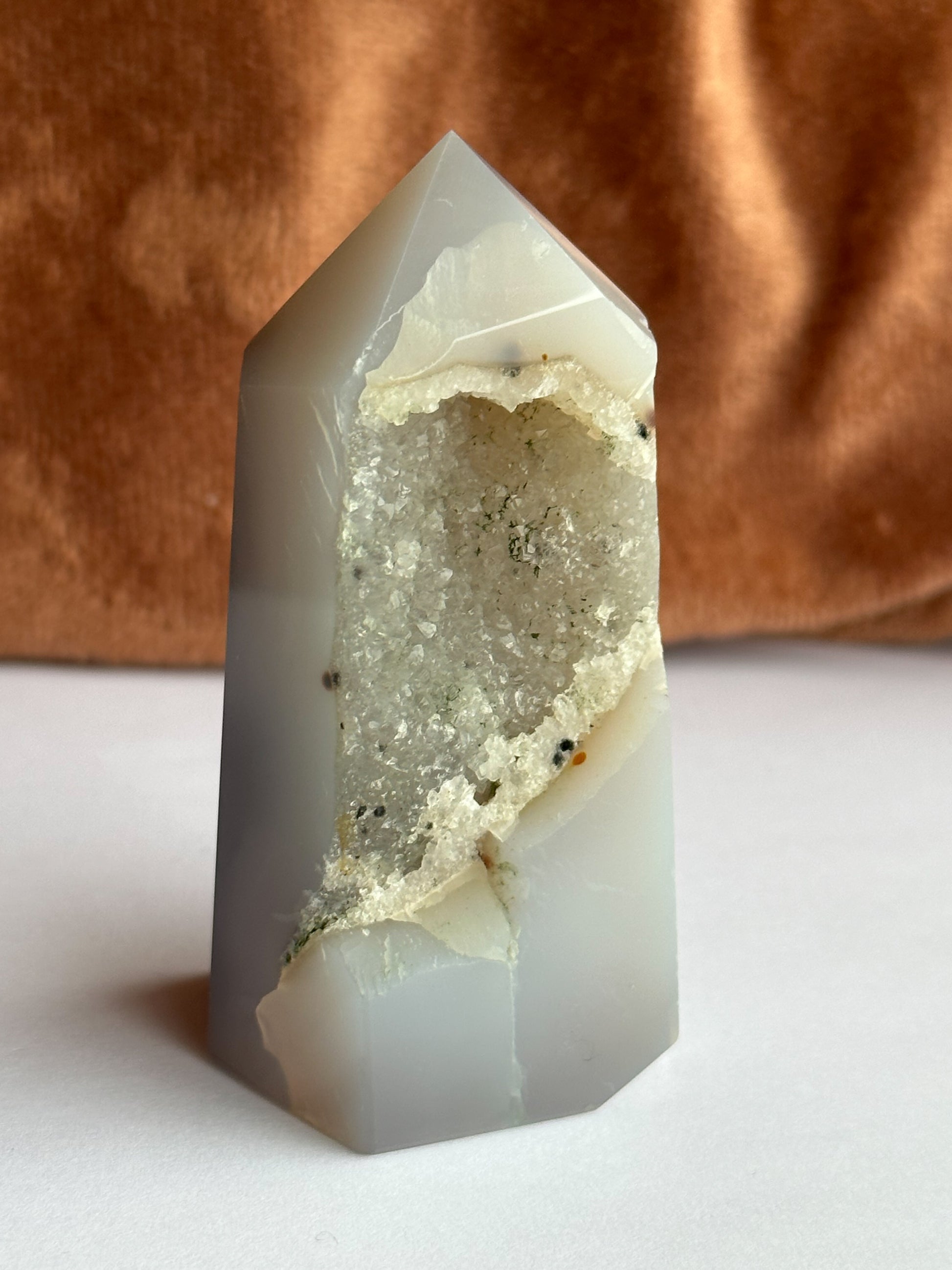 Druzy agaat toren, een geweldige uitbreiding van jouw collectie. Deze toren is gemaakt van Agaat en heeft een prachtige kleur met bandvorming. Deze toren heeft een prachtige druzy wat zorgt voor een schitterende kristalvorming. Deze toren is prachtig om jouw collectie met edelstenen uit te breiden. Het vonkelende effect van de druzy creëert schitterende kristallen op het oppervlak van de agaat, waardoor elke toren een uniek is.