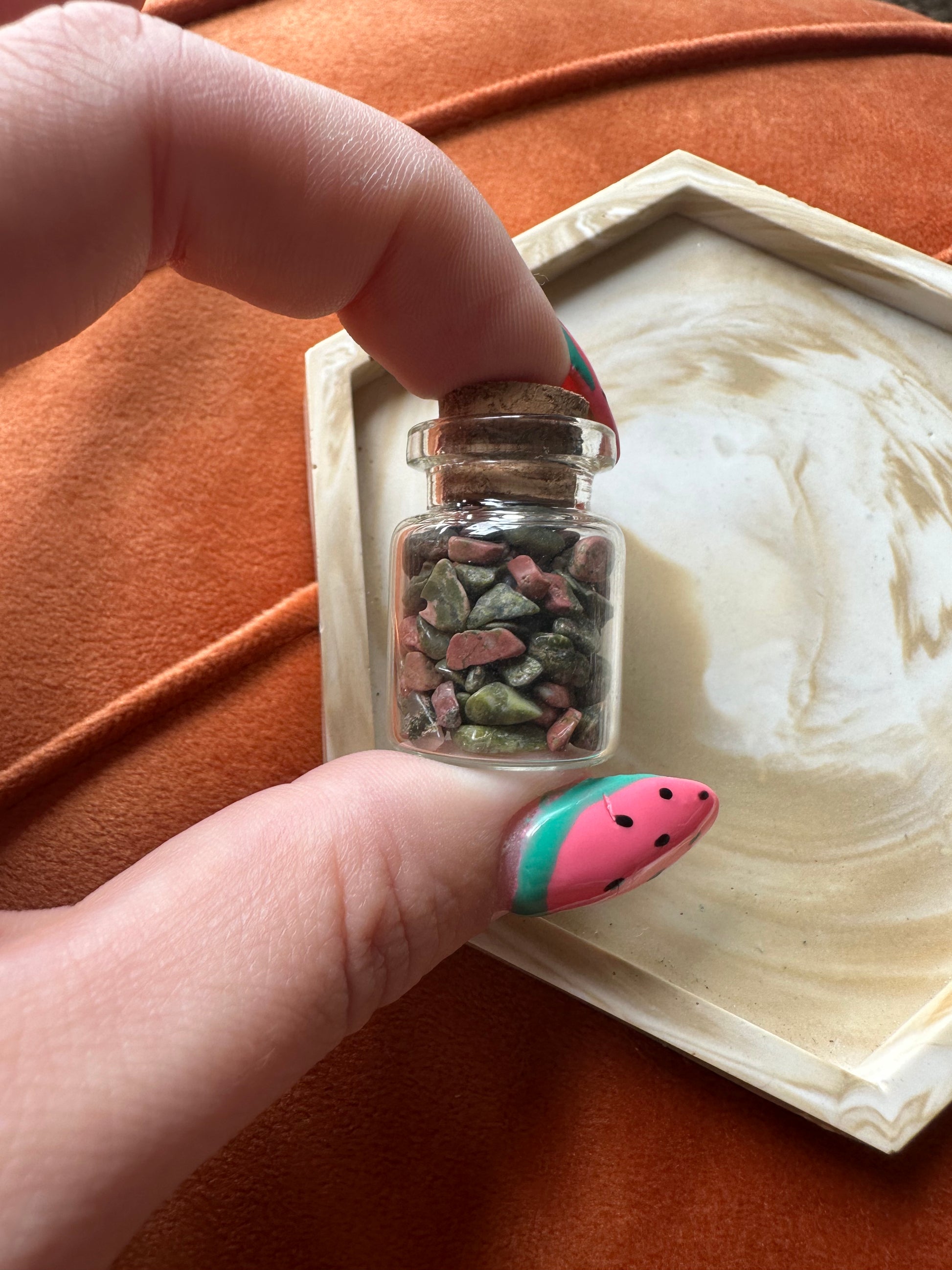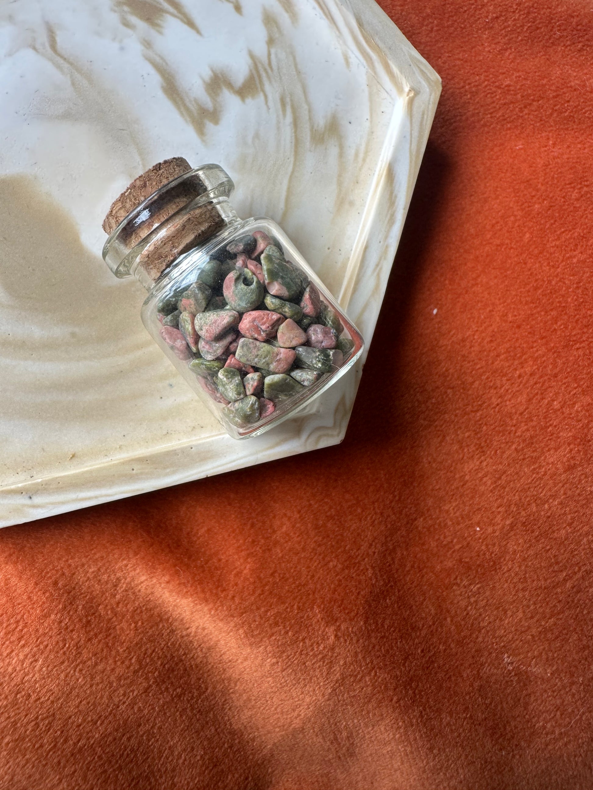Dit flesje vol kalmte is perfect om cadeau te geven of ergens in huis neer te zetten. Dit flesje is gevuld met Unakiet. Deze steen is erg geschikt voor een flesje vol geluk door de mooie werking.