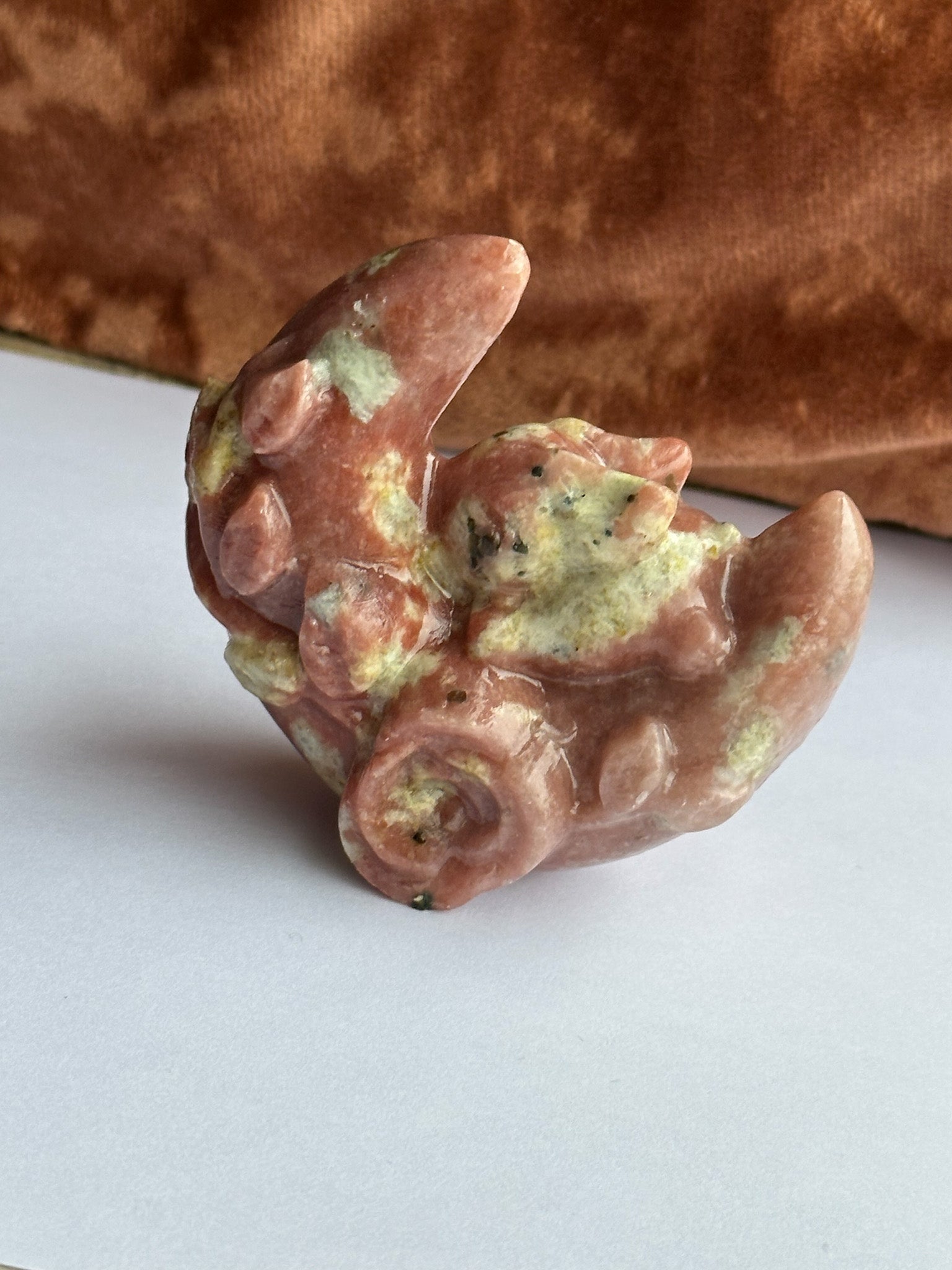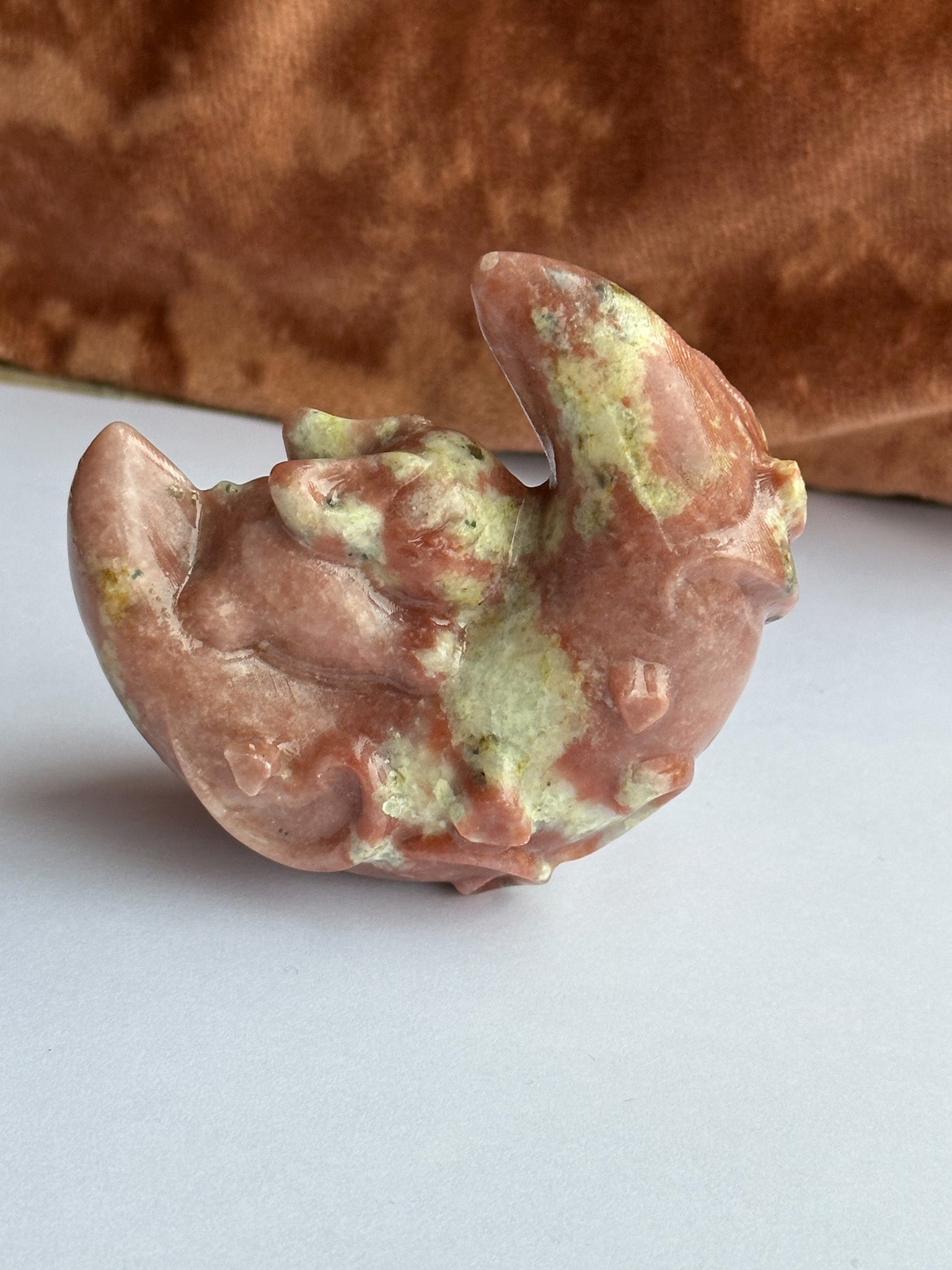Deze carving is over the moon van jouw! Dit is een super mooie grote carving van een konijn op een maan met gave bloemen details gemaakt van Roze toermalijn. Dit is een prachtig cadeau voor jezelf of iemand die ook gek is op konijnen! De carving kan op zichzelf staan.