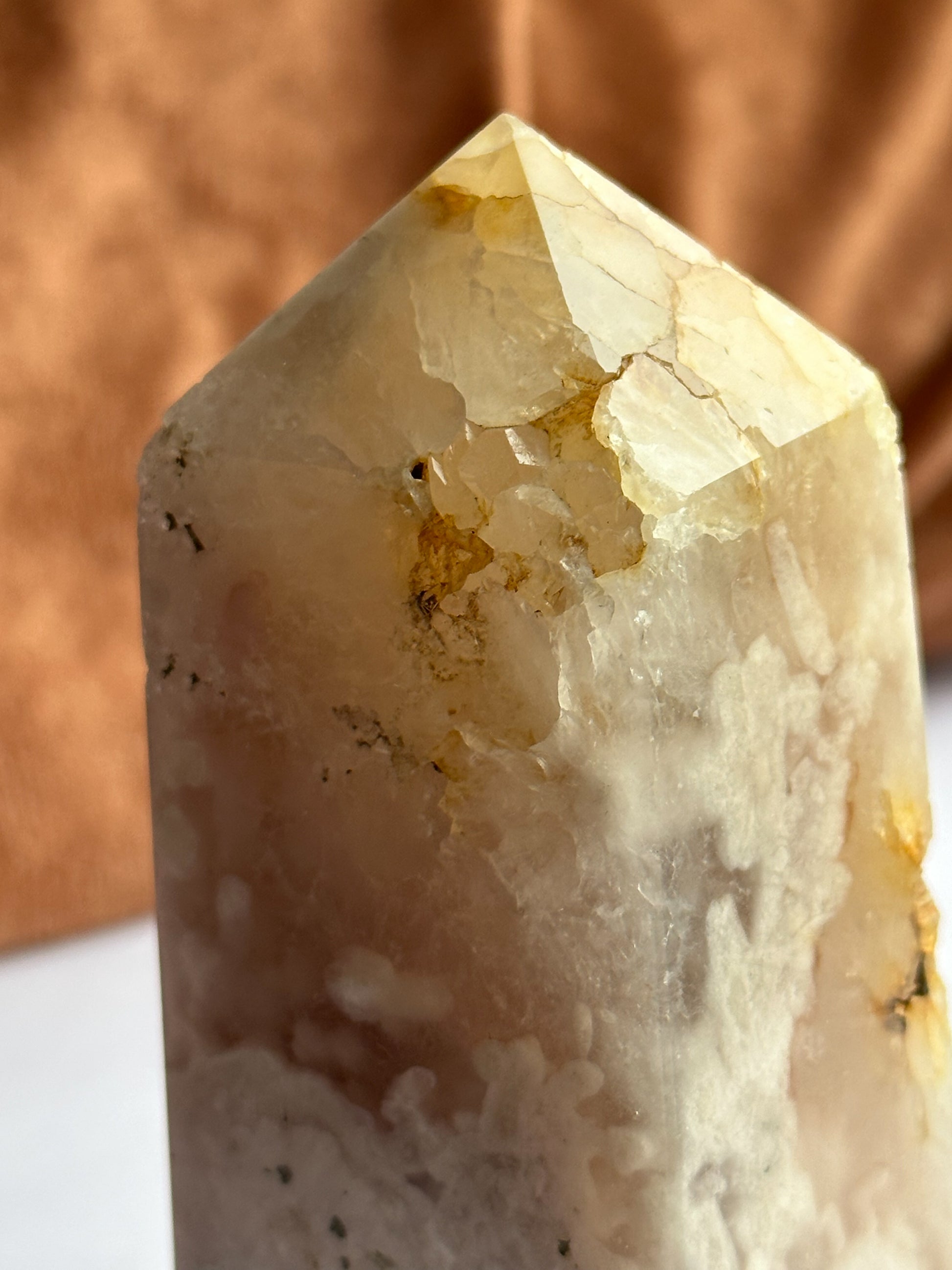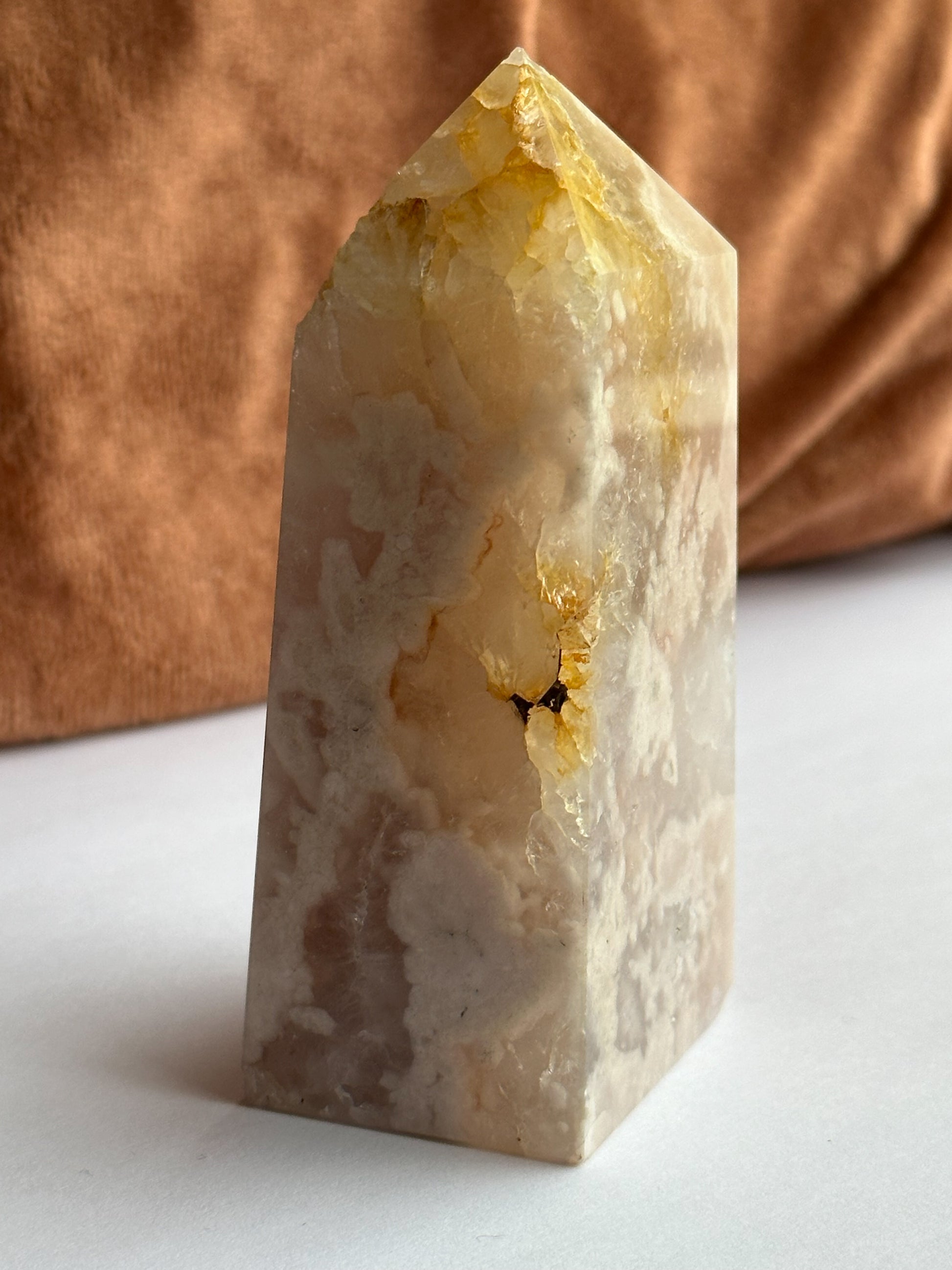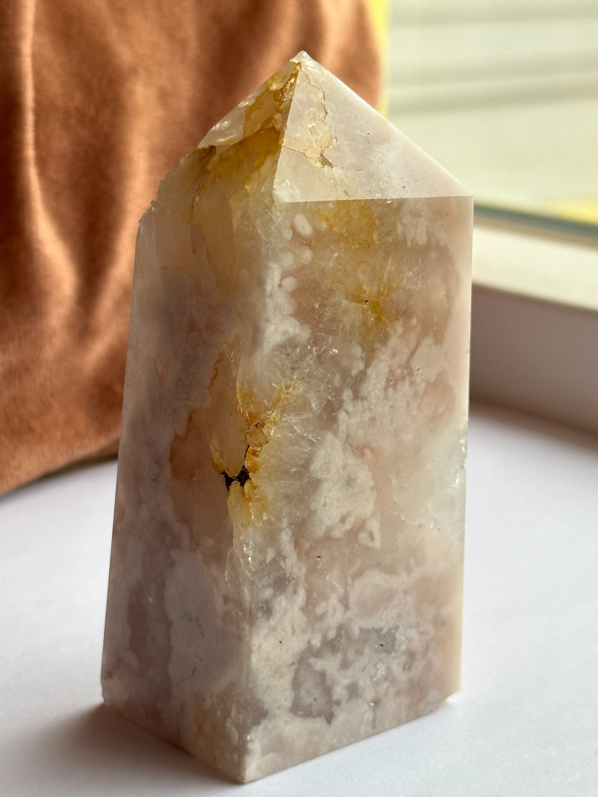Deze parel konden wij niet laten liggen natuurlijk, dit is een prachtige roze Amethist toren. De zachte roze kleuren passen in elk interieur en hebben een mooie rustige uitstraling. De roze amethist kan natuurlijk niet ontbreken aan jouw collectie! Deze edelsteen heeft namelijk ook een prachtige werking. Als je goed kijkt zie je ook een mooie mix met bloemagaat. De toren is niet 100% recht maar het is natuurlijk een natuur product!