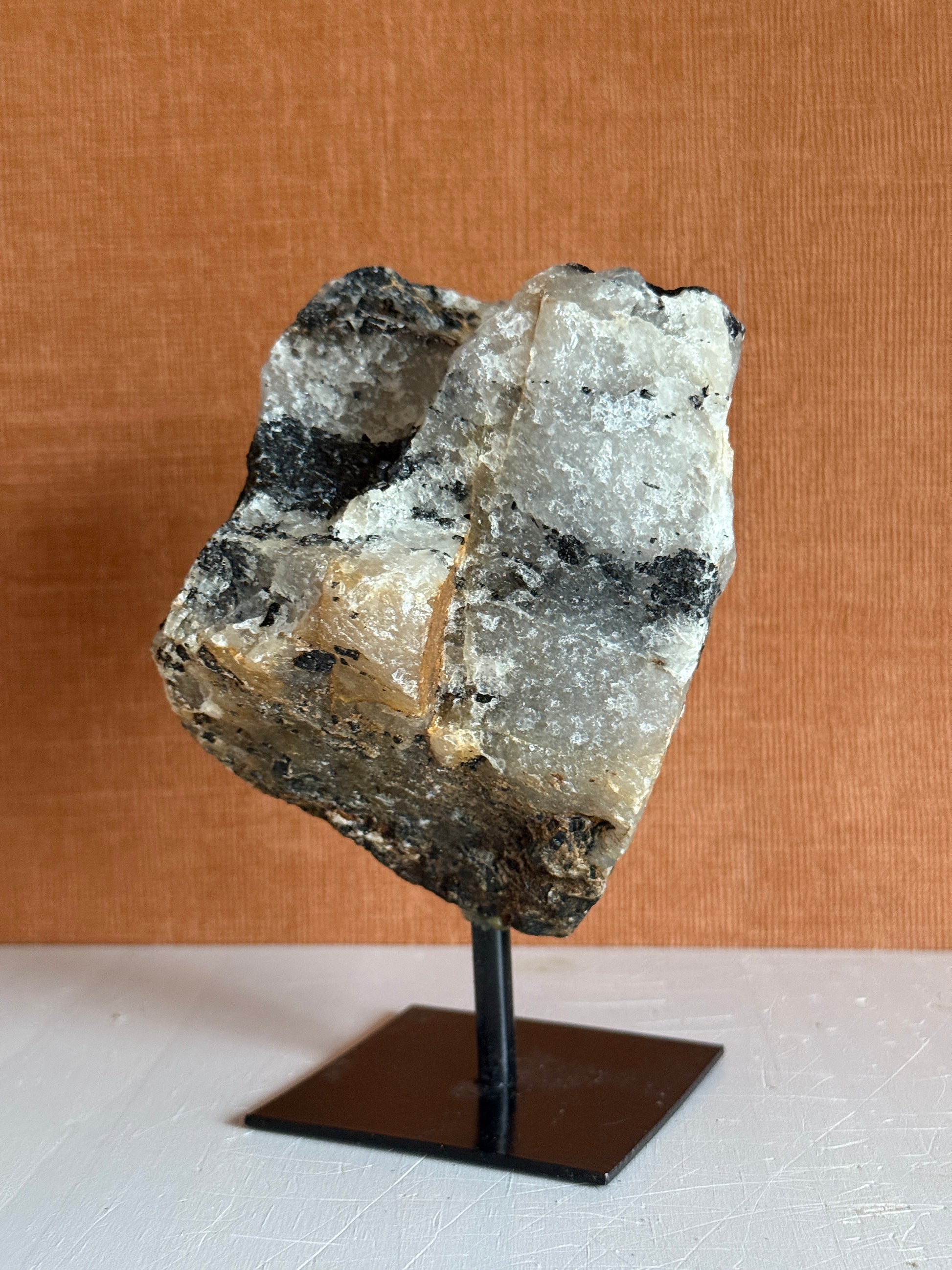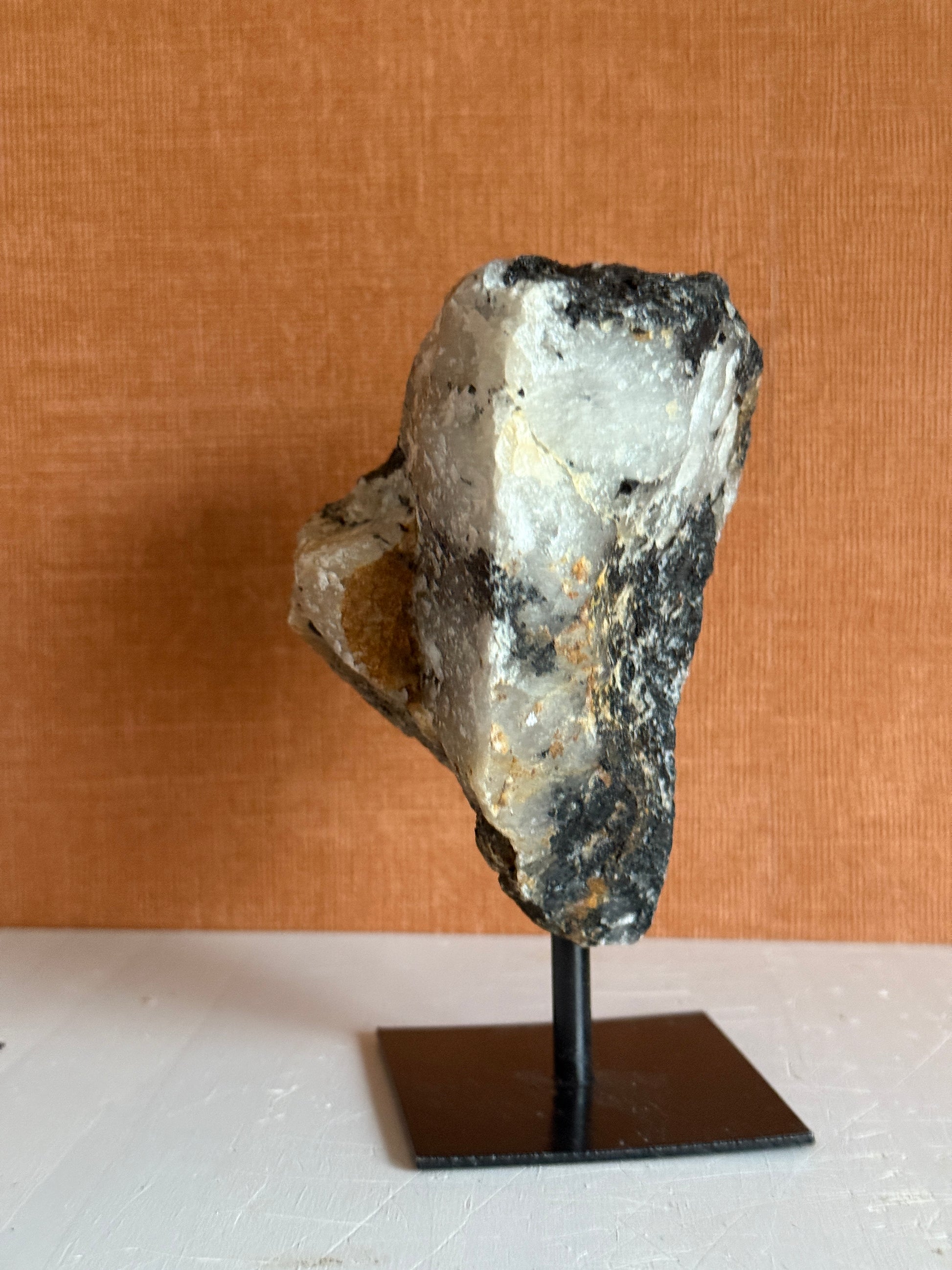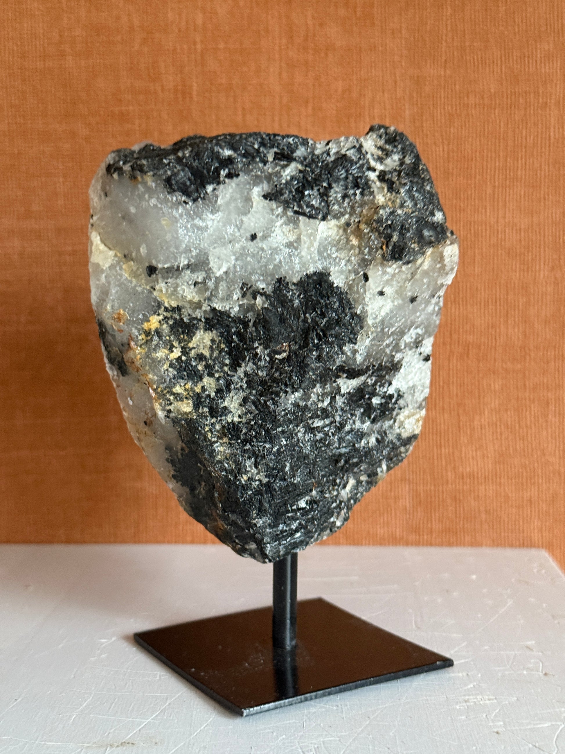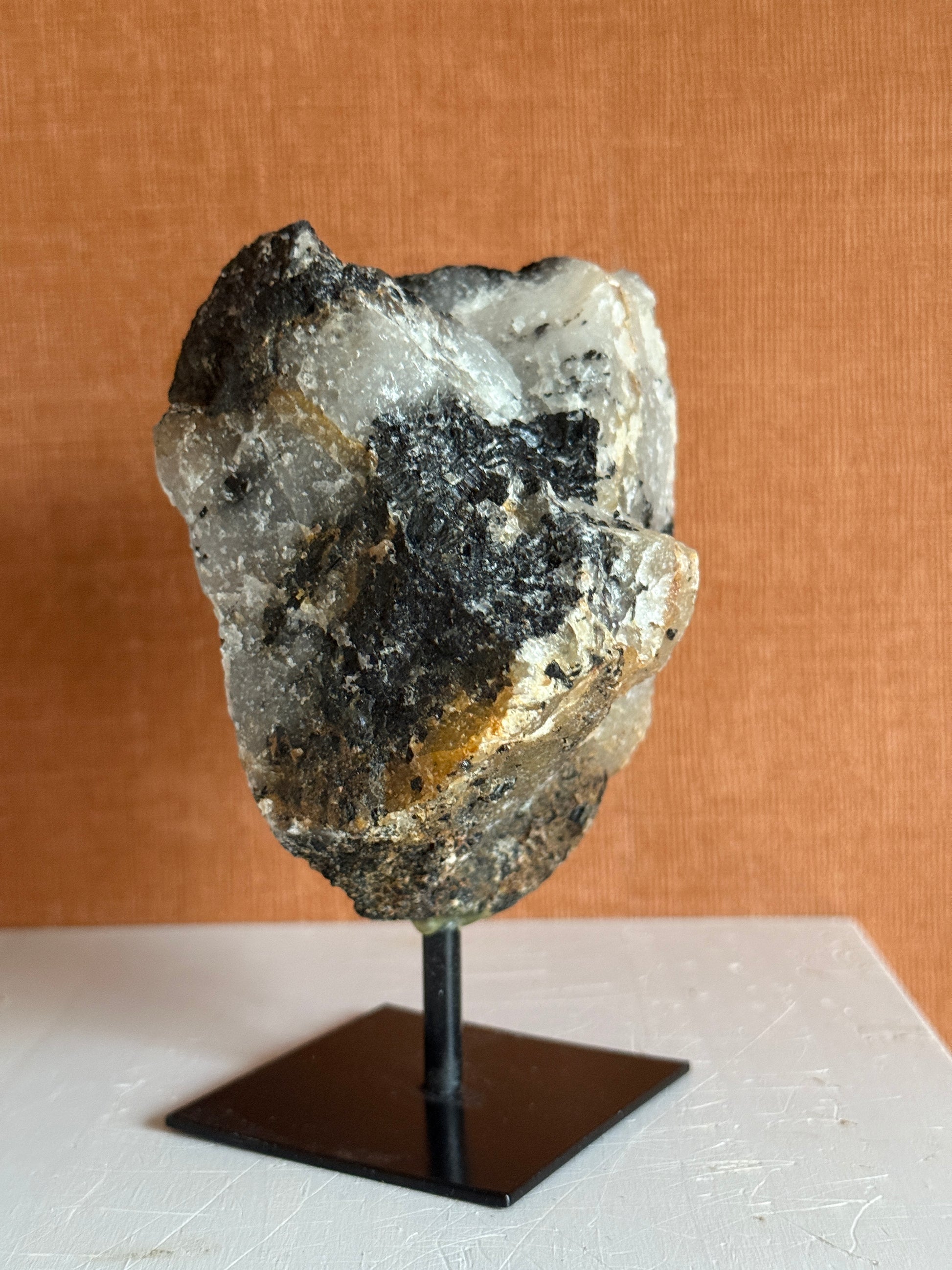 Een prachtige combinatie van Toermalijn en kwarts. Een stoere en ruwe edelsteen op een prachtige standaard. Mooie rustige kleuren en een ruwe unieke verschijning. Prachtig in het interieur!