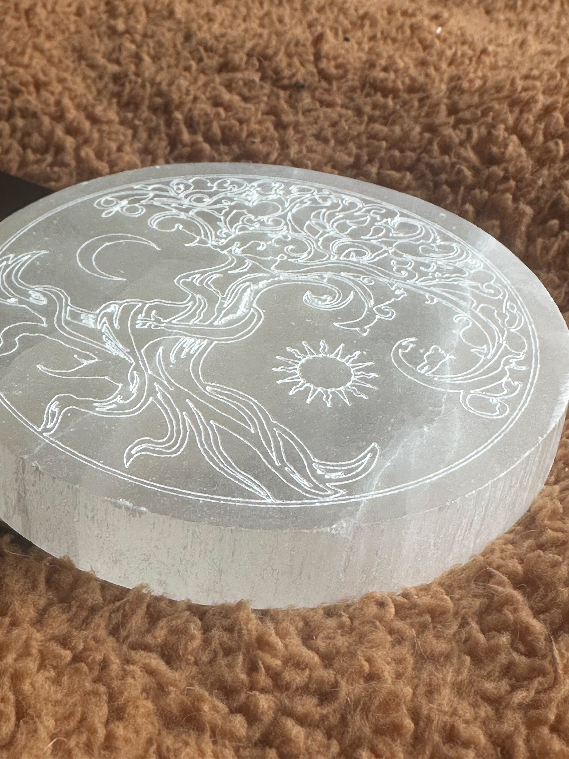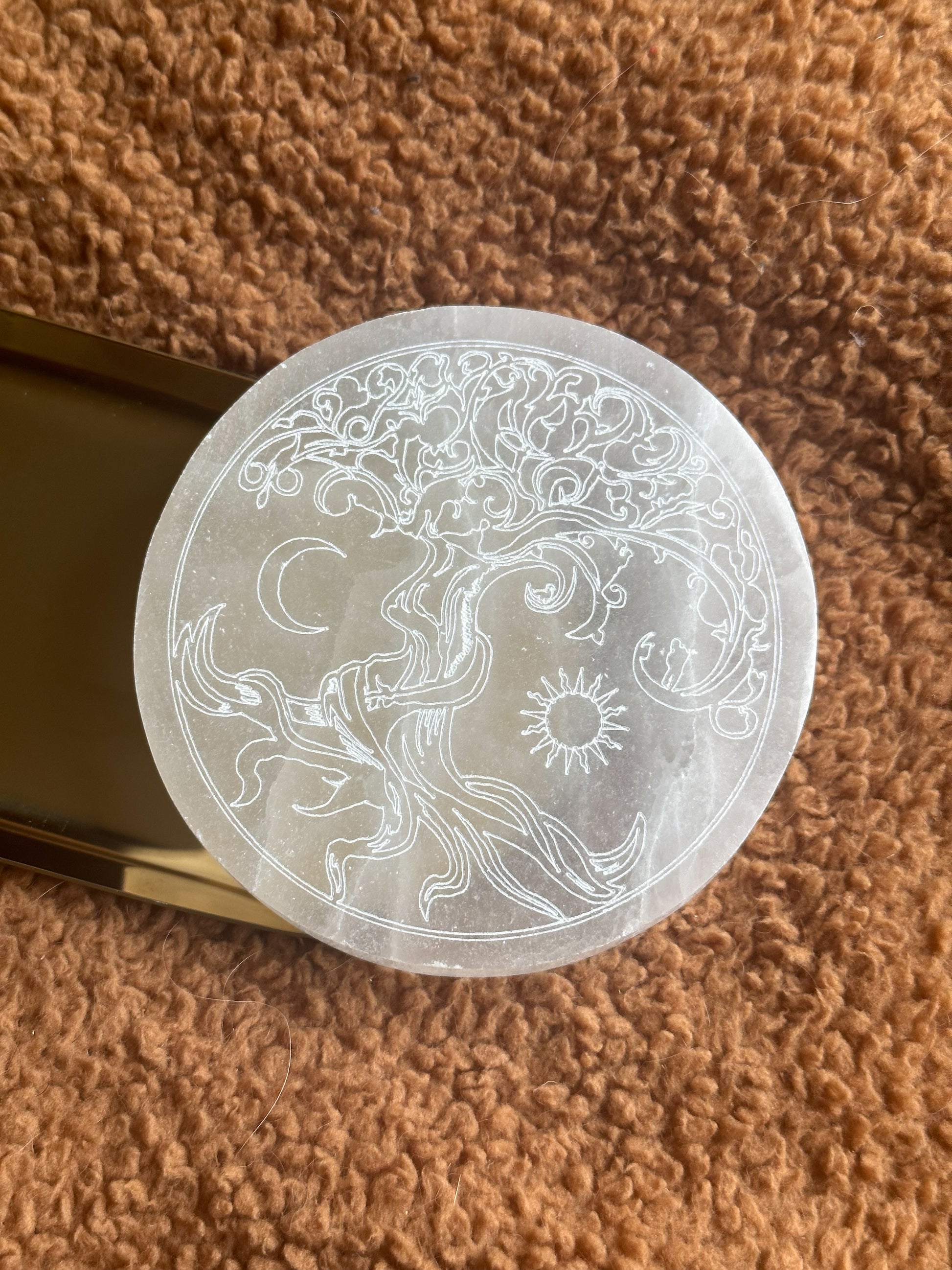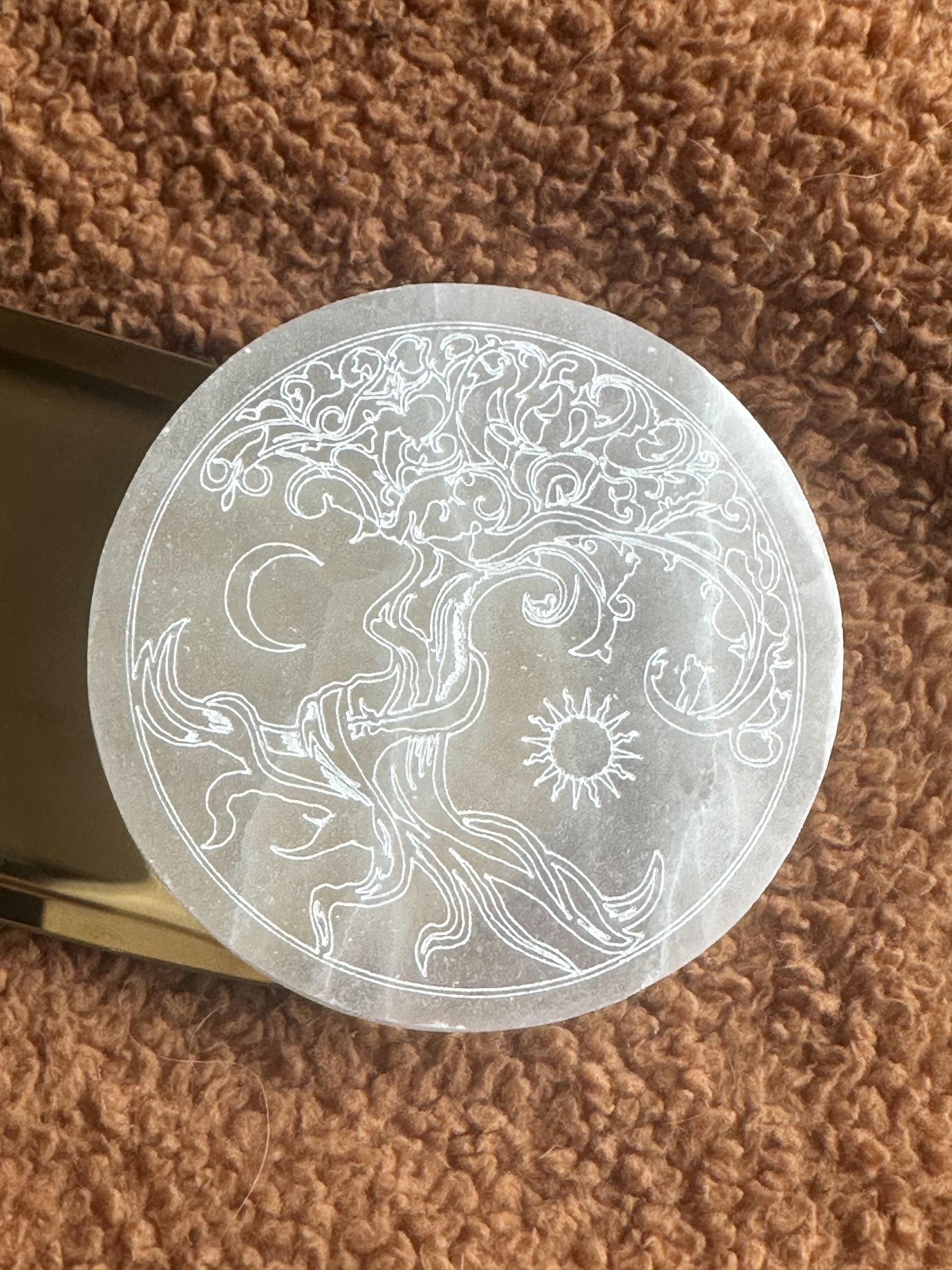 Wil jij jouw edelstenen gemakkelijk opladen? Dat kan met deze leuke Selenietschijf! Naast dat het leuk staat in jouw interieur kan je hiermee dus erg goed jouw edelstenen collectie opladen! Deze schijf heeft een mooie print met een levensboom wat zorgt voor een unieke uitstraling.