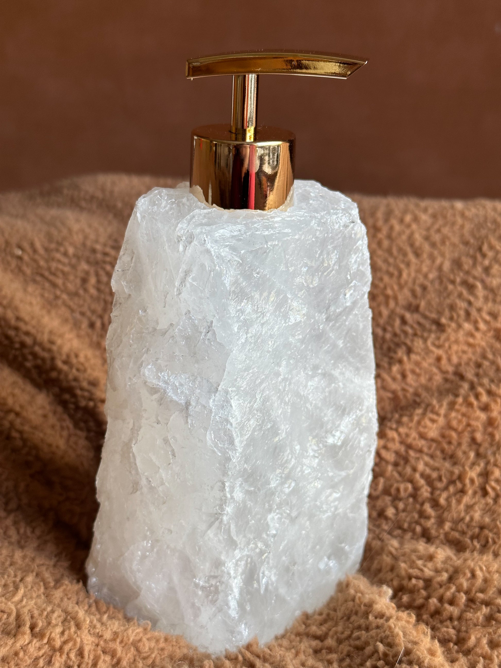 Onze zeeppompjes zijn niet alleen handig in gebruik, maar voegen ook een vleugje elegantie toe aan je badkamer of keuken. Dit zeeppompje is gemaakt van Bergkristal met gouden details. In dit zeeppompje kan je zelf een handzeep doen maar natuurlijk ook een hand créme of een ander fijn product.
